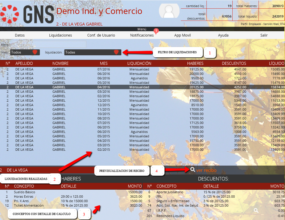 2 ->Liquidaciones: Vemos una grilla de datos donde cada fila es una liquidacion realizada al empleado. Al seleccionar una se verá en el recuado inferior el detalle de los conceptos que forman el recibo (haberes y descuentos)